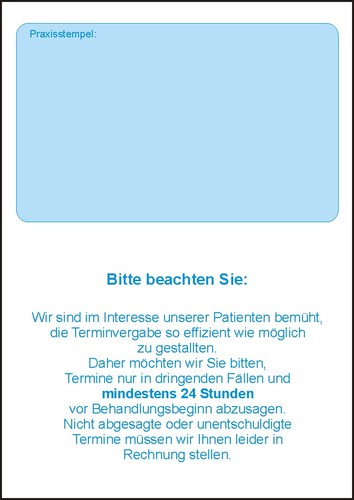 Terminzettelblock DIN A7 (PE = 5 Blöcke)Dieser moderne Terminzettel-Vordruck ist so gefaltet, dass die Angaben zu den Behandlungsterminen auf einer Seite schnell, übersichtlich und lesbar ausgefüllt werden können. Das Format DIN A7 ist ausreichend groß und Sie haben Platz für bis zu 10 Termine. Auf der Rückseite kann die Praxisadresse aufgestempelt werden. Auf einen Block befinden sich 75 Terminzettel. Packungseinheit (PE) = 5 Blöcke à 75 Blatt.